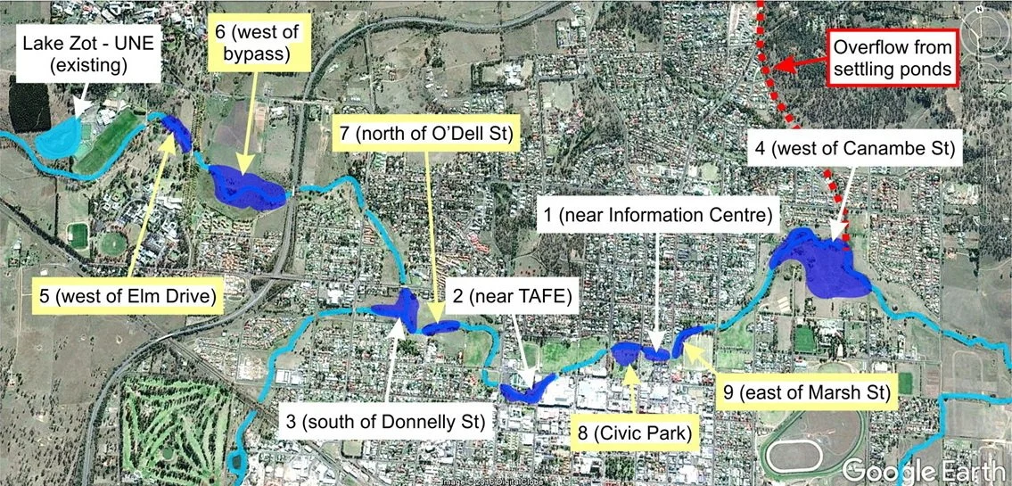 Google Earth image showing our suggestions for 9 of the proposed 15 potential locations for billabongs, constructed wetlands or ponds.